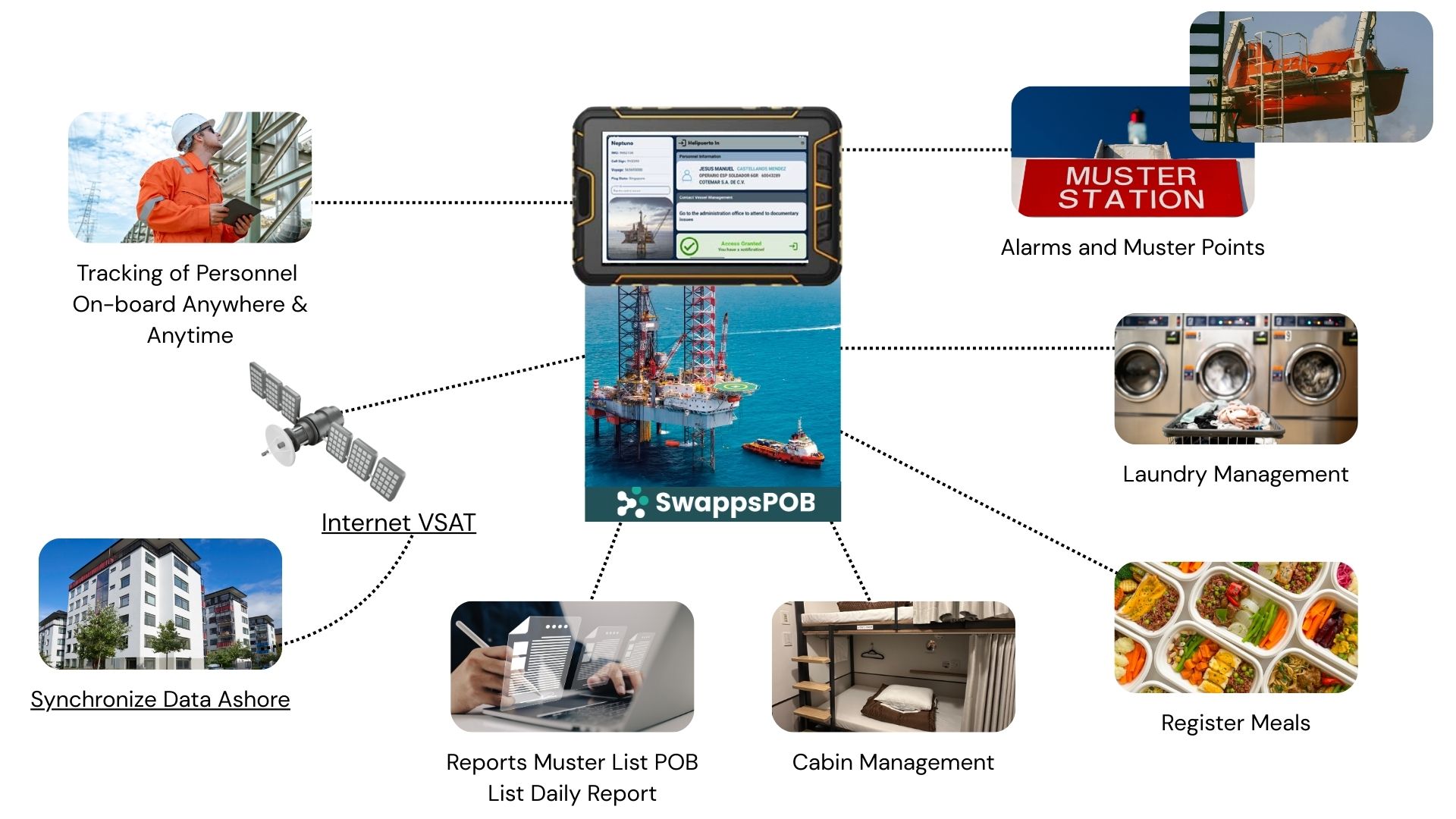 Real-time personnel tracking with seamless synchronization between vessel and shore-based operations.